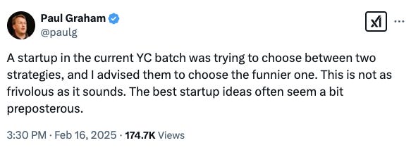 If you look at ideas in this way and think “I wonder…”, you open your mind to think of alternative ideas based on all your other half-baked ones. Try this at home: Observe something around your house or neighborhood, and start the sentence with “I wonder…” and see where that takes you. That’s the power of observation and giving effective feedback. It’s the improv equivalent of “Yes and.” As Paul Graham noted, if you have to select between two different ideas, choose the funnier sounding one — it’s often the one that will be the most interesting to push forward.